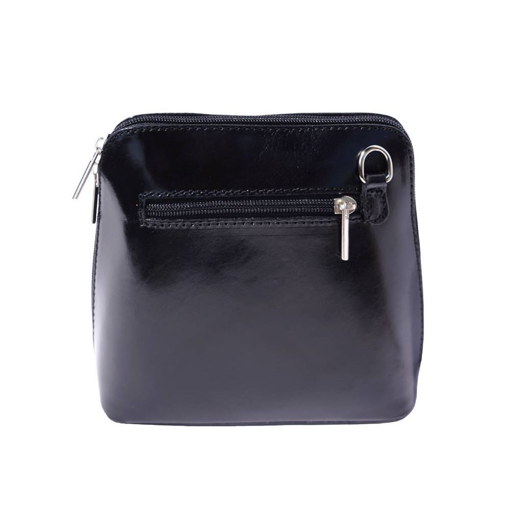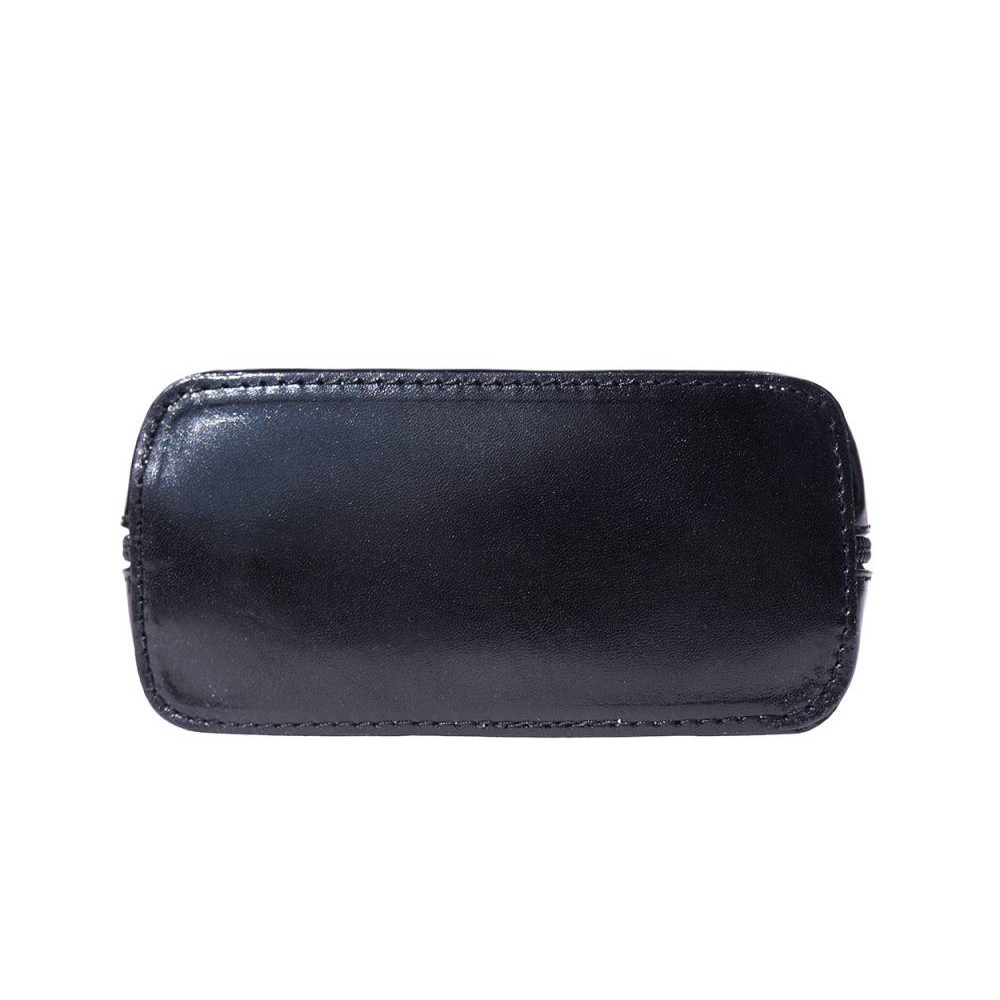 Este o geantă mică din piele de viţel autentică. Structură rigidă, are buzunar cu fermoar pe partea din spate.
